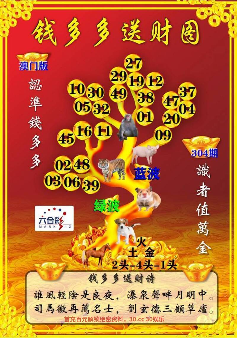 308期:【钱多多送财诗】 降温三两度清凉,峰回路转至山颠。庄严禅寺依山建,三五一群香客旺。 综合六肖:龙牛鼠蛇兔猴 综合双波:红波+蓝波  |